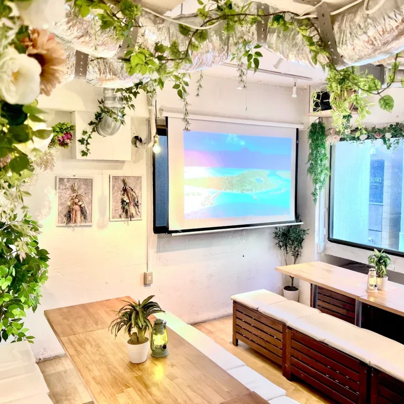 昼飲みパーティーの幹事様必見!渋谷駅徒歩3分「渋谷ガーデンルーム3F」はプロジェクター・飲み放題・BBQ・カラオケなど多彩なオプションが充実。おしゃれなドライフラワー空間で特別な時間をお過ごしください!